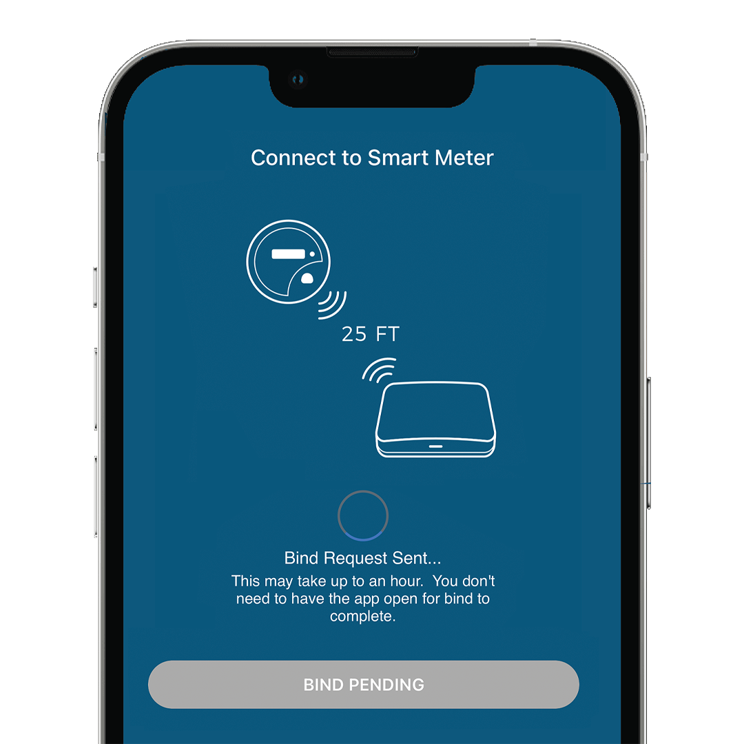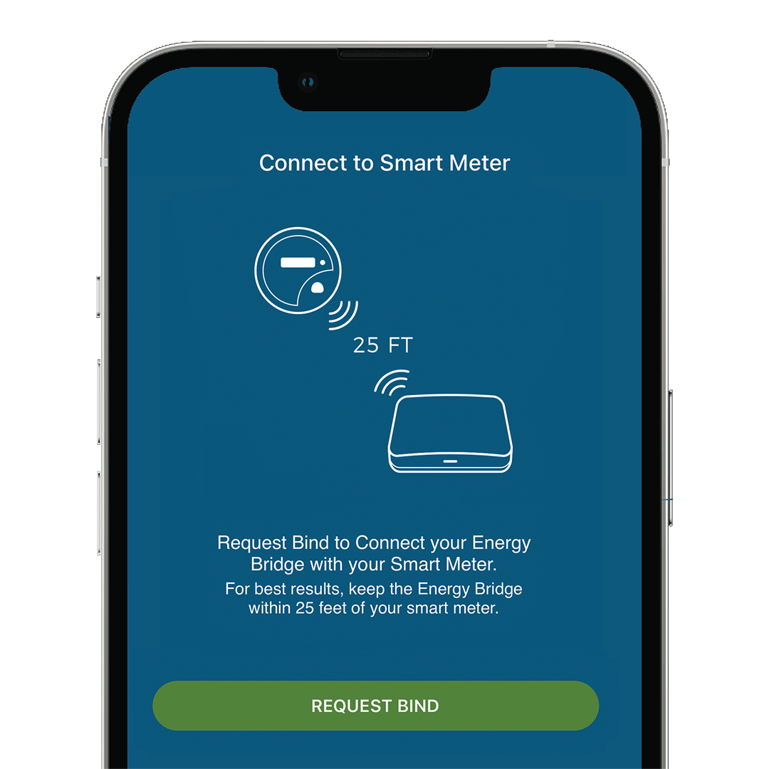 To connect to your smart meter, select the request bind button. Make sure to keep your Energy Bridge within 25 feet of your smart meter.