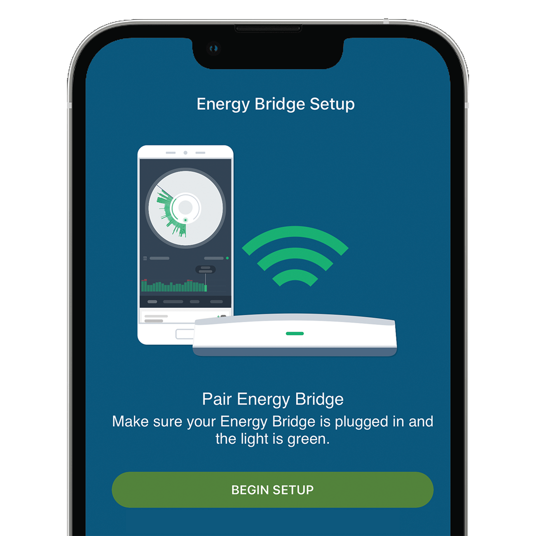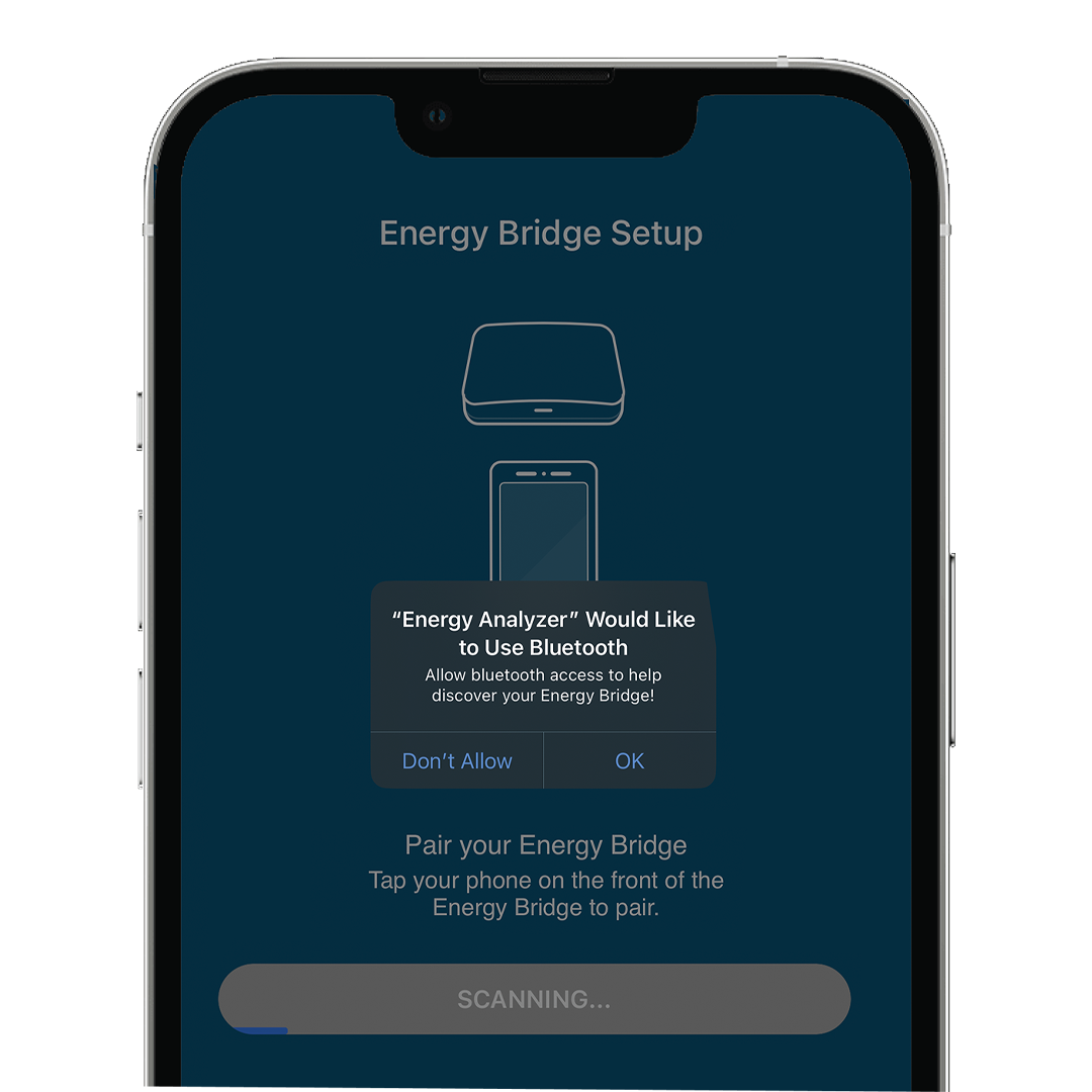 Tap your phone on the front of the Energy Bridge to begin pairing. Allow Energy Analyzer to use Bluetooth by tapping “OK.” The Energy Bridge light should be blue when it’s paired. Next pair the Energy Bridge to your Wi-Fi and smart meter.